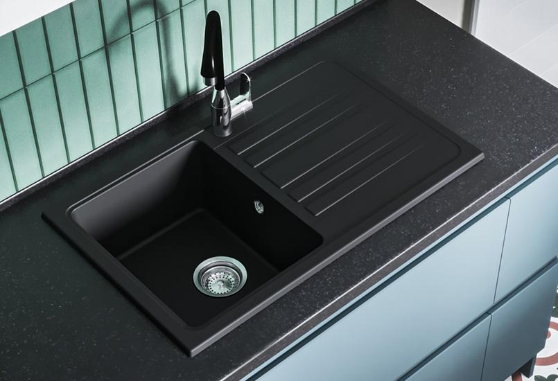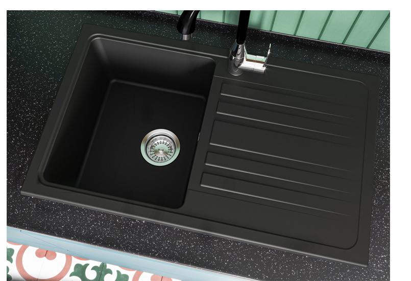 Kvalitetno pomivalno korito iz umetnega kamna. 80% materiala – kremenov pesek, 20% - kompozitni vezni material.