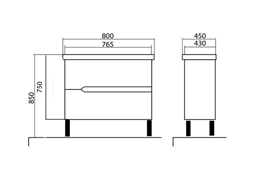 Višina 850 mm, širina 800 mm, globina 450 mm.