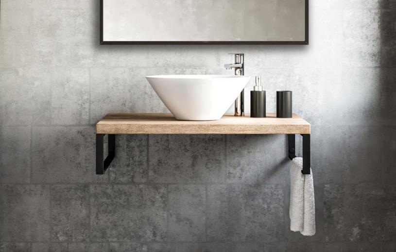 Pult za umivalnik Desk 100 hrast z dvema črnima nosilcema je dober izbor za vašo kopalnico! Površina je odporna madežam in vlagi.